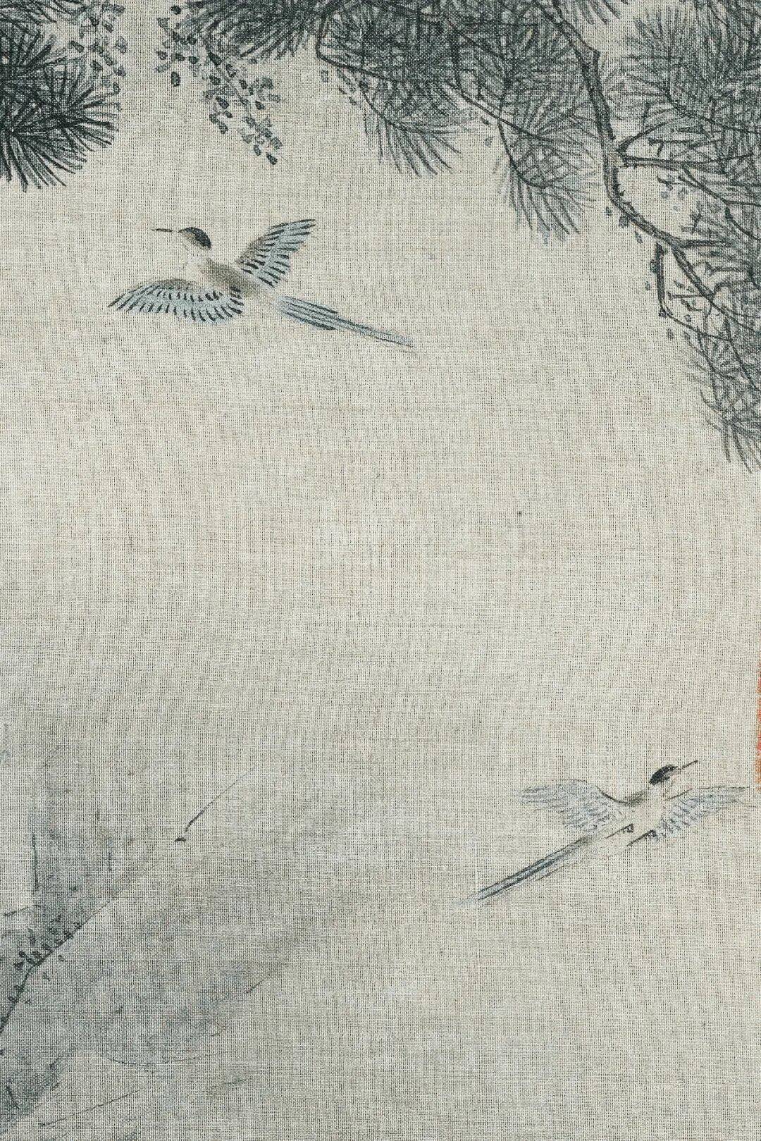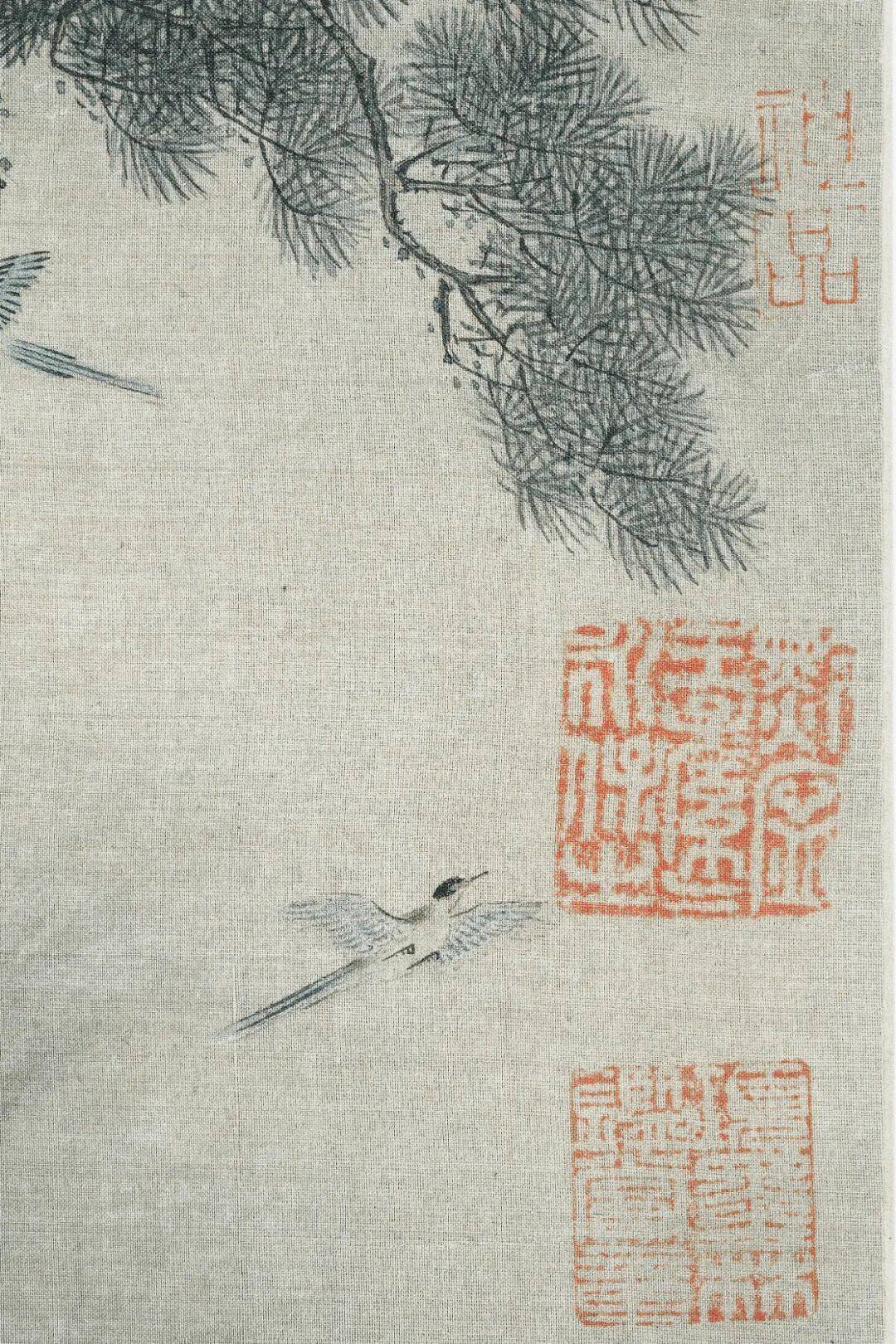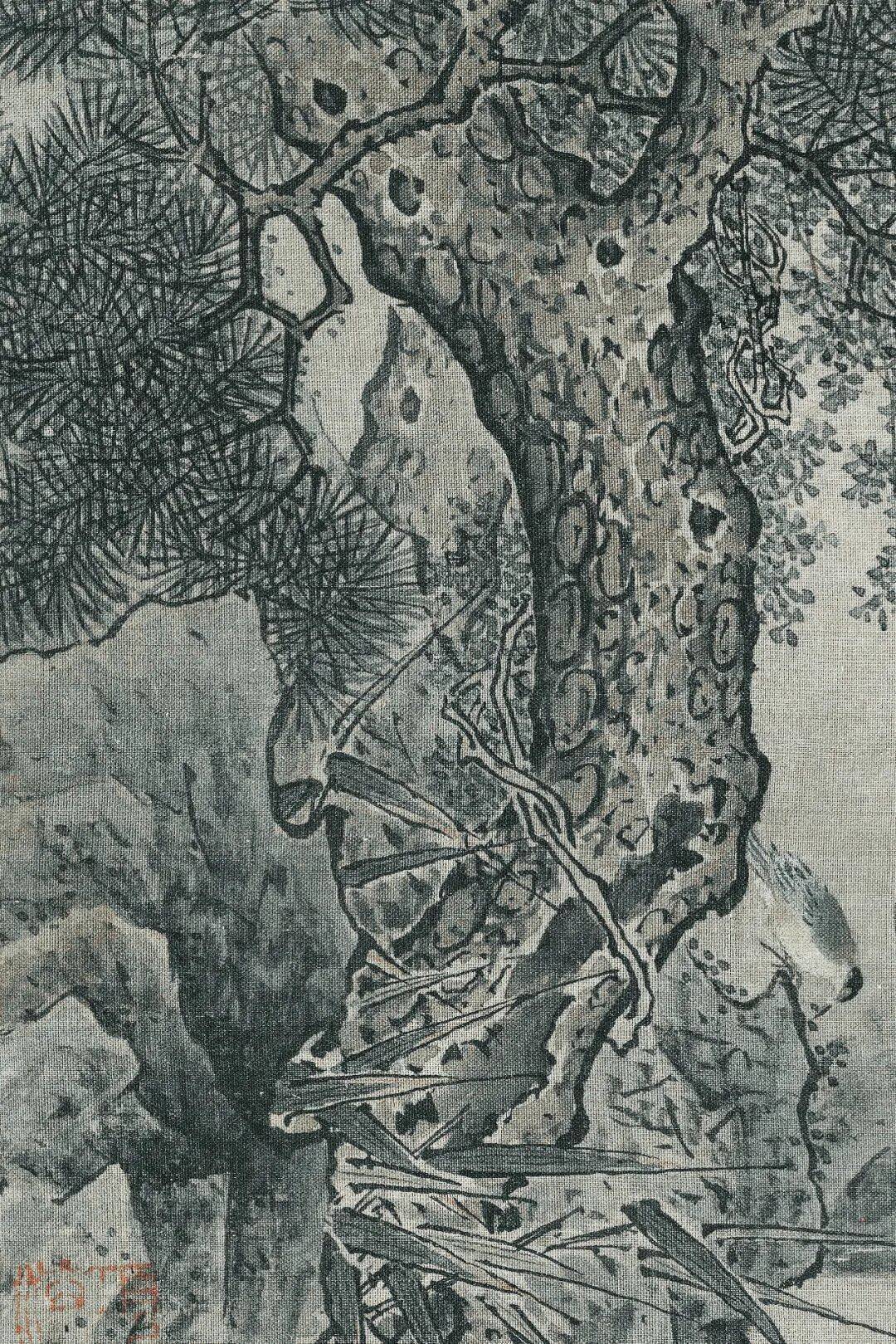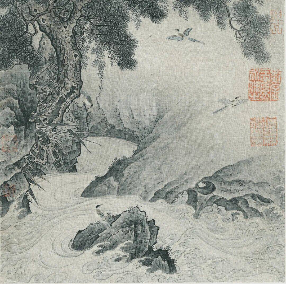 宋佚名《松涧山禽图》以25.3厘米见方的绢本,构建了一个微观却磅礴的自然宇宙。画面中,古松以浓墨勾鳞、花青染针,其虬曲枝干如青铜器纹般苍劲,与缠绕的枯藤形成刚柔对话;山石以淡青破墨皴染,硬质肌理与飞溅的水花虚实相生,暗合道家“刚柔相济”的哲学。四对山鹊的动态捕捉堪称精妙:或振翅凌空,或俯身啄食,画家以疏简笔法勾勒其羽翼,却通过姿态的微妙差异赋予每只鸟独立灵魂——左侧山鹊展翅时尾羽的弧度,右侧栖枝者爪尖的力度,皆见匠心。