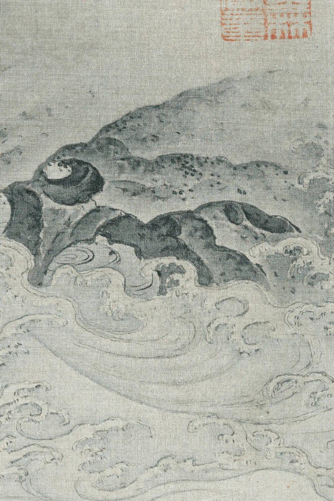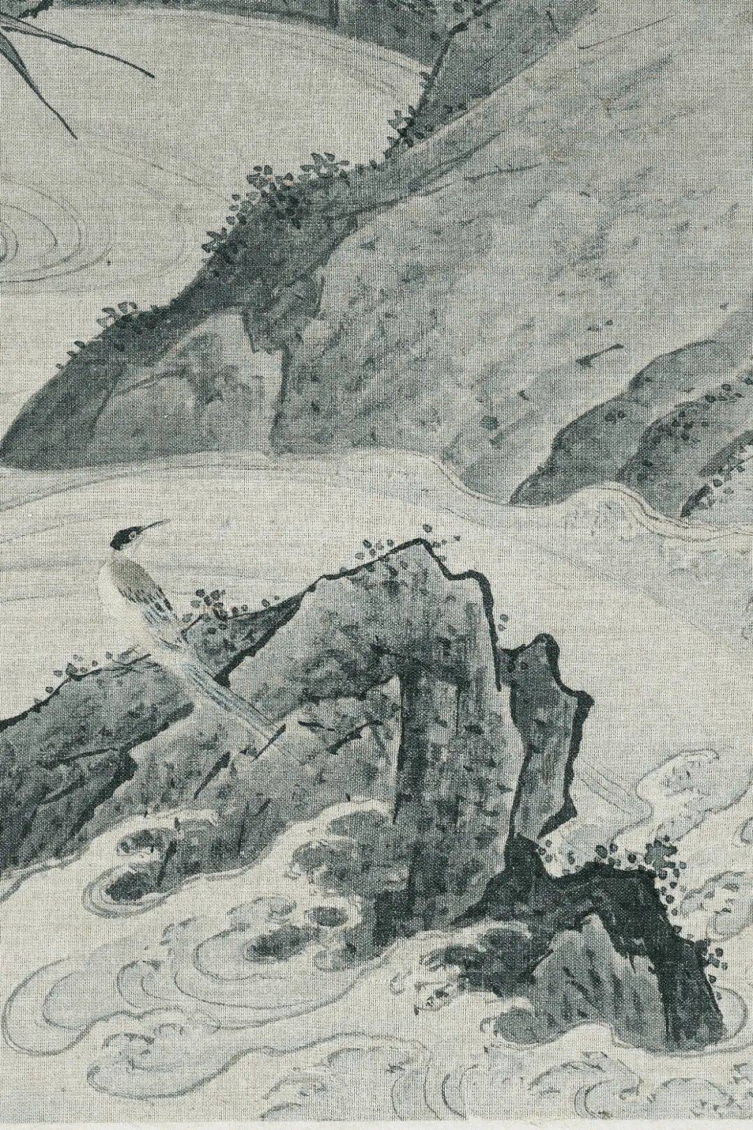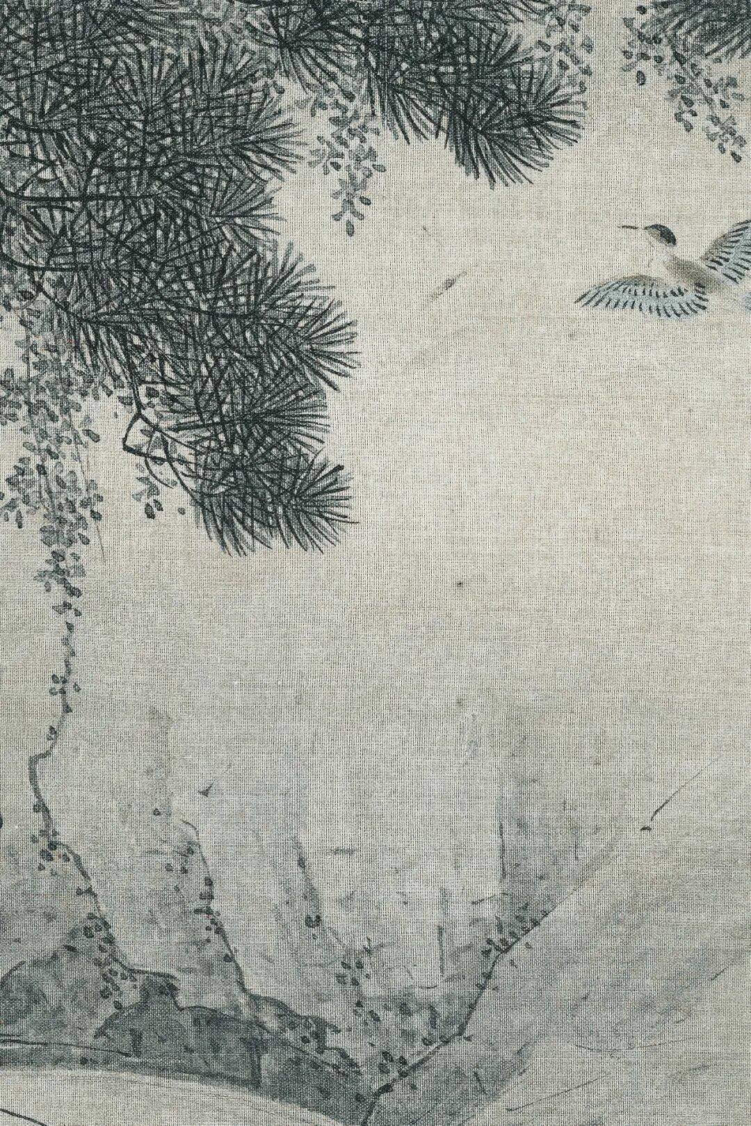 宋佚名《松涧山禽图》以25.3厘米见方的绢本,构建了一个微观却磅礴的自然宇宙。画面中,古松以浓墨勾鳞、花青染针,其虬曲枝干如青铜器纹般苍劲,与缠绕的枯藤形成刚柔对话;山石以淡青破墨皴染,硬质肌理与飞溅的水花虚实相生,暗合道家“刚柔相济”的哲学。四对山鹊的动态捕捉堪称精妙:或振翅凌空,或俯身啄食,画家以疏简笔法勾勒其羽翼,却通过姿态的微妙差异赋予每只鸟独立灵魂——左侧山鹊展翅时尾羽的弧度,右侧栖枝者爪尖的力度,皆见匠心。